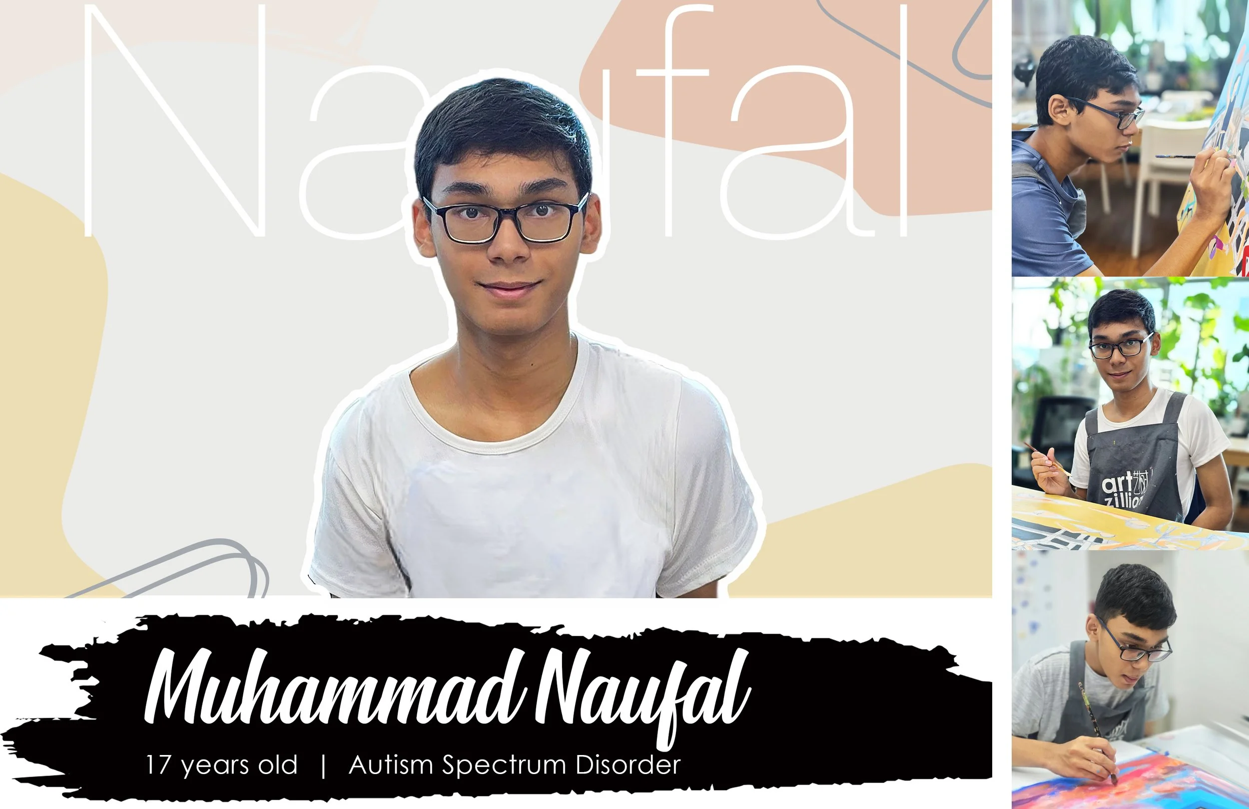Muhammad Naufal a 15-year-old student at Pathlight School, is a passionate artist with mild autism. Diagnosed at three and non-verbal in his early years, Naufal now expresses himself through vibrant speech and art, each piece showcasing his thoughts, interests, and growing confidence.