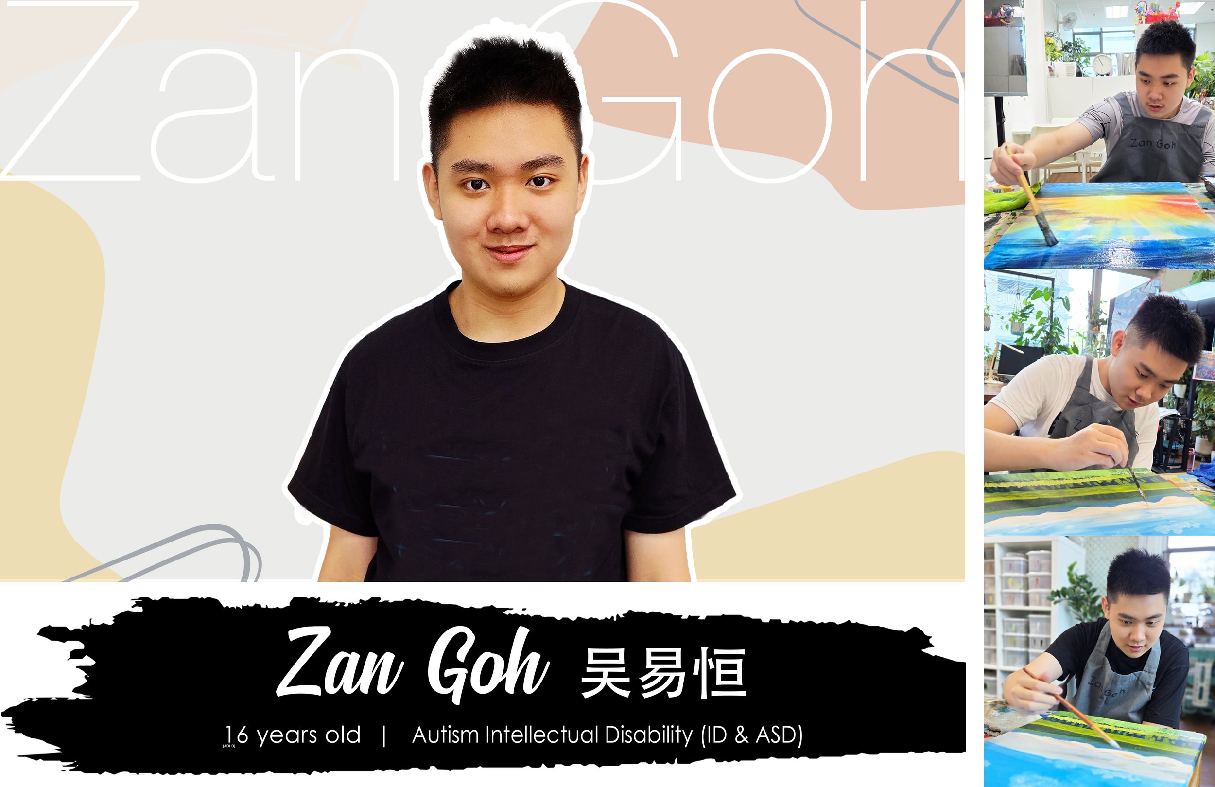 Zan is a budding teenage artist on the autism spectrum who is drawn to bold colours, strong shapes, numbers, and alphabets. These elements have become a meaningful way for him to express his thoughts and emotions, resulting in vibrant and expressive artworks that reflect his curiosity and growing confidence.